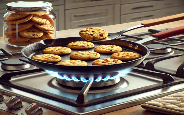 프라이팬에 과자를 올리고 약불로 살짝 구워줍니다. 기름은 사용하지 않는 것이 좋습니다.