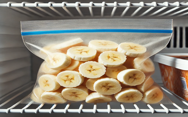 바나나는 스무디, 베이킹 등에 사용하기 위해 냉동 보관할 수 있습니다. 껍질을 벗긴 바나날를 랩으로 싸거나 조각내어 냉동용 백에 넣어 보관하면 편리합니다.