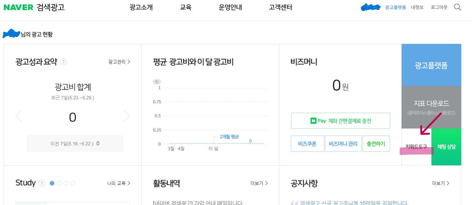 네이버 검색광고에 들어가면 우측에 '키워드도구' 버튼이 보여요 클릭!