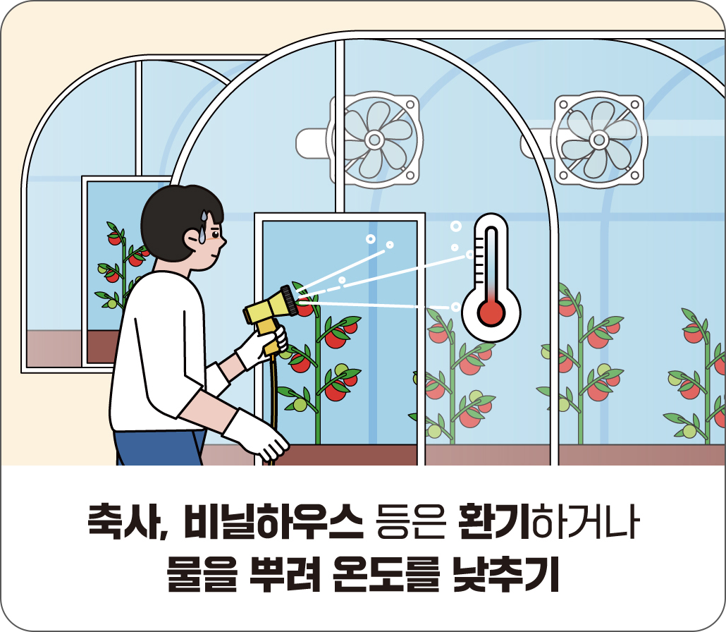 양식 어류는 꾸준히 관찰하고, 얼음을 넣어 수온 상승을 억제하세요. 가축이나 어류가 폐사하면 신속하게 방역기관에 신고하고 조치에 따라야 합니다.